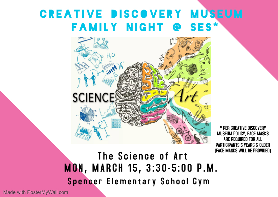 Save the Date! FUN, FREE FAMILY EVENT! The Creative Discovery Museum (Chattanooga), that we all know and love, will be at S.E.S. on April 21, 3:30-5:30 p.m. for Full STEAM Ahead. This event will have students & families participating in 9 different activity stations where they will design & construct a variety of projects! The class with the highest parent participation & attendance will win a special attendance celebration!